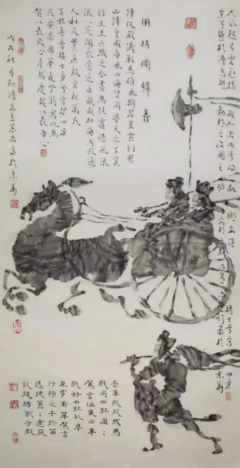 当时由大作家李存葆先生撰文,其词曰:“余钟情汉画像石刻久矣,尔来去嘉祥、南阳探迹揽胜,则为震古烁今之汉代艺术所痴迷,我沉眠于石刻碑林之间,嗟叹大雅久之不作,先人无论凿马刻人,铭兽镂神,皆铁画银钩,摅骋技巧委蛇有章。余汲取古汉画石刻艺术的精华,表现古将士鼓鸣旌飘,驱坚策肥的出征场面,旨在壮华夏之雄风”。他这段跋文写的太好了。