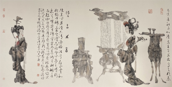 刘:你就是进一步跨界,古人早就把书法跨进来了,你进一步和汉画像石跨在一起,这是从你开始,所以说你对汉画像石钻研,你有一股钻研精神,这个精神就是李可染先生的“压钉子”精神,我把图钉往墙上按,往里伸进去了,抓住这一个点压,这个“钉子”精神可能给我们一些启发。对中国水墨人物画的认识,对文人画的认识不仅仅限于笔墨、限于毛笔,不仅仅限于书法,不仅仅限于篆刻,还可以打开另一片新的天地,这个天地就是跨界,所以说中国画始终是跨界的,是综合性的艺术,诗书画印是如此,武术、中医、舞蹈全都在这里,你把汉画像石融入进去,是立了一功的,应该说是很独特的。你开辟了一个审美领域啊,一个新的笔墨奇迹!