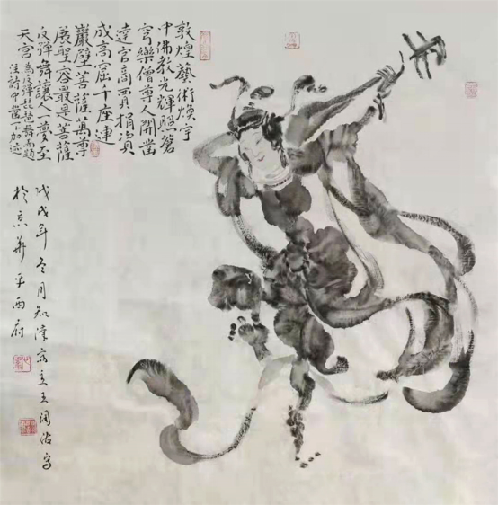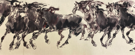 王:第二是总结新汉画的来龙去脉,起码有四个来源;1.学院派,我是解放军艺术学院国画系毕业,受到了严格的理论、造型、笔墨训练,为新汉画创新打下了坚实的基础;2.古典主义:古典指汲取汉代画像石刻,民间剪纸、皮影、唐三彩等姊妹艺术的精华,将汉画像的石刻形态转换成新汉画的水墨形态,将中国画的没骨画法开拓了一个新的领域;3.西方古典艺术与现代派构成。从西方素描、色彩到现代形式构成融化到了我的新汉画之中,关键是个“化”字而不是图求外表。对素描而言,我不仅研究西方素描,还研究为中国画笔墨服务的中国画素描该怎么画,提出了以线为主、明确结构、线面结合、塑造形体的中国画素描四要素,在清华大学高级研修班授课十年有余,走在了各大院校素描教学的前列。