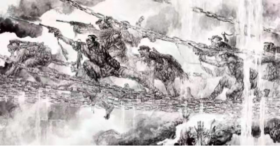 刘:你这种解释与处理很好,比较大胆精谨与辩证。特别是将造型意识和笔墨意识结合起来不易,看了《飞夺泸定桥》,我很感动,造型那么生动,深刻,细节的力量深化了主题和精神的表现,笔墨又是这么活脱,这在历史画中造型与笔墨取得高度一致是少有的,是一种力度。按照你积极进取的个性到了八十、九十岁以后肯定还有新的高度,因为艺术的最高境界还在于有法无法之间。这是时代赋予你的历史使命啊。