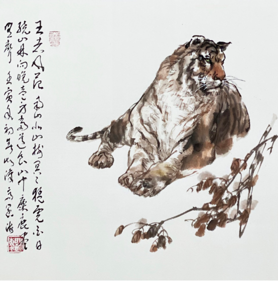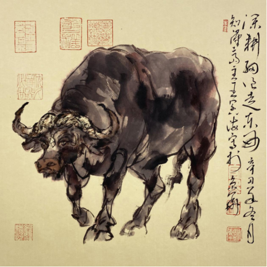 依此理论与中国画笔墨相结合,就会明确线往哪里勾,墨往哪里落,很有可操作性,使我的学生受益匪浅。这些年来我的驴、马、牛、羊、老虎的写意画都是以此理论而画的,对前人有了突破性发展;4.文人画的品质。长期以来我始终坚持文人画诗、书、画、印四者并举的修行路线,来提高我的新汉画艺术品质、品位、品格。从南宋梁楷的《泼墨仙人图》,到八大山人、徐谓、张大千的泼墨没骨画法,来汲取营养。我的新汉画没骨画法既来自于传统、又有新的技法突破。若讲新汉画的创新我是自创一派,但对于恪守文人画的人文品质我又是保守一派。