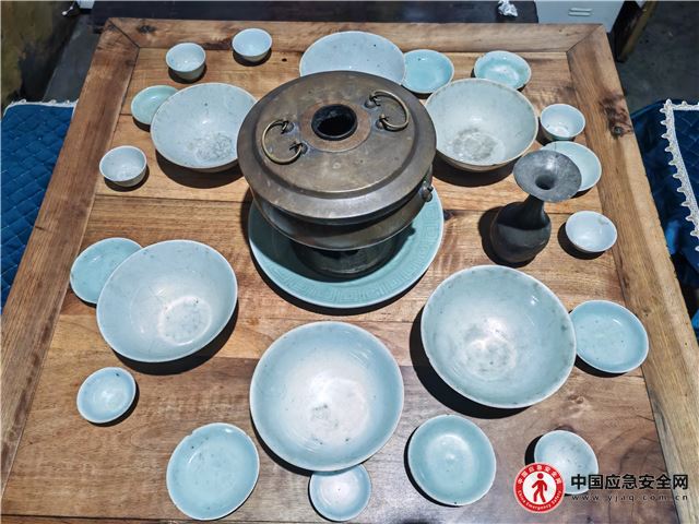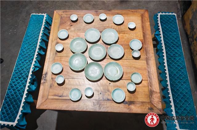 踏入老宅屋内,光线虽稍显昏暗,却恰好让一方90公分见方的黄花梨木八仙桌成为视觉焦点——桌上一组豆青色瓷器,正静静散发着清亮温润的光泽。细观这套器物,规制极为讲究:中央摆放着8只5寸碗与8只5寸碟,外围则整齐搭配着手碟(醋碟)、酒盅,还有1只锡酒壶点缀其间,从餐具配套的完整性、尺寸的协调性到颜色的统一性,都透着传统饮食礼仪的考究与精致。