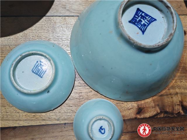 凑近端详,更能发现这些瓷器的细腻之处:釉色温润如玉,并非直白的鲜亮,而是仿佛从瓷胎深处缓缓透出微光;表面带着浅浅的裂纹与细小划痕,那是百年时光留下的独特印记,非但不显残破,反倒添了几分岁月沉淀的质感。尤为特别的是,每件瓷器的里外釉色各不相同,碗口边缘还精心饰有金边,酒盅则采用敞口带足的经典形制,线条流畅雅致;翻过瓷器底部,更能看到每一件都印有不同的年号款识,清晰印证着它们的独特身份,一器一物皆显当年工匠的精湛技艺。
