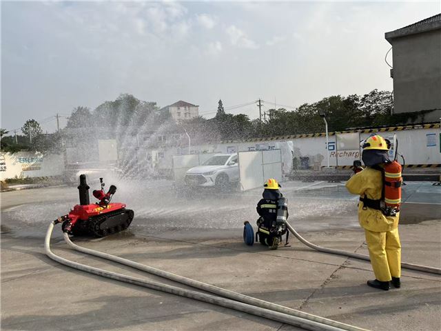 演练现场,参演人员分工明确、配合紧密,从火情预警、人员疏散到初期火情处置,各环节响应迅速、操作规范。此次演练特别引入移动机器人灭火装备,其高效精准的火情侦察与灭火作业,成为处置新能源汽车火灾的“科技助力”。
